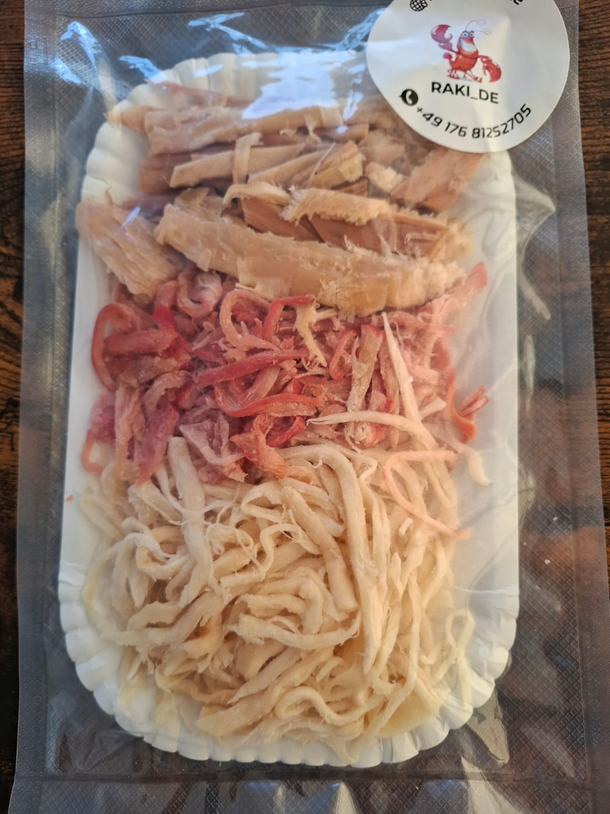 Zarte getrocknete Streifen mit intensivem Meeresgeschmack. Perfekt zu Bier oder als würziger Snack.